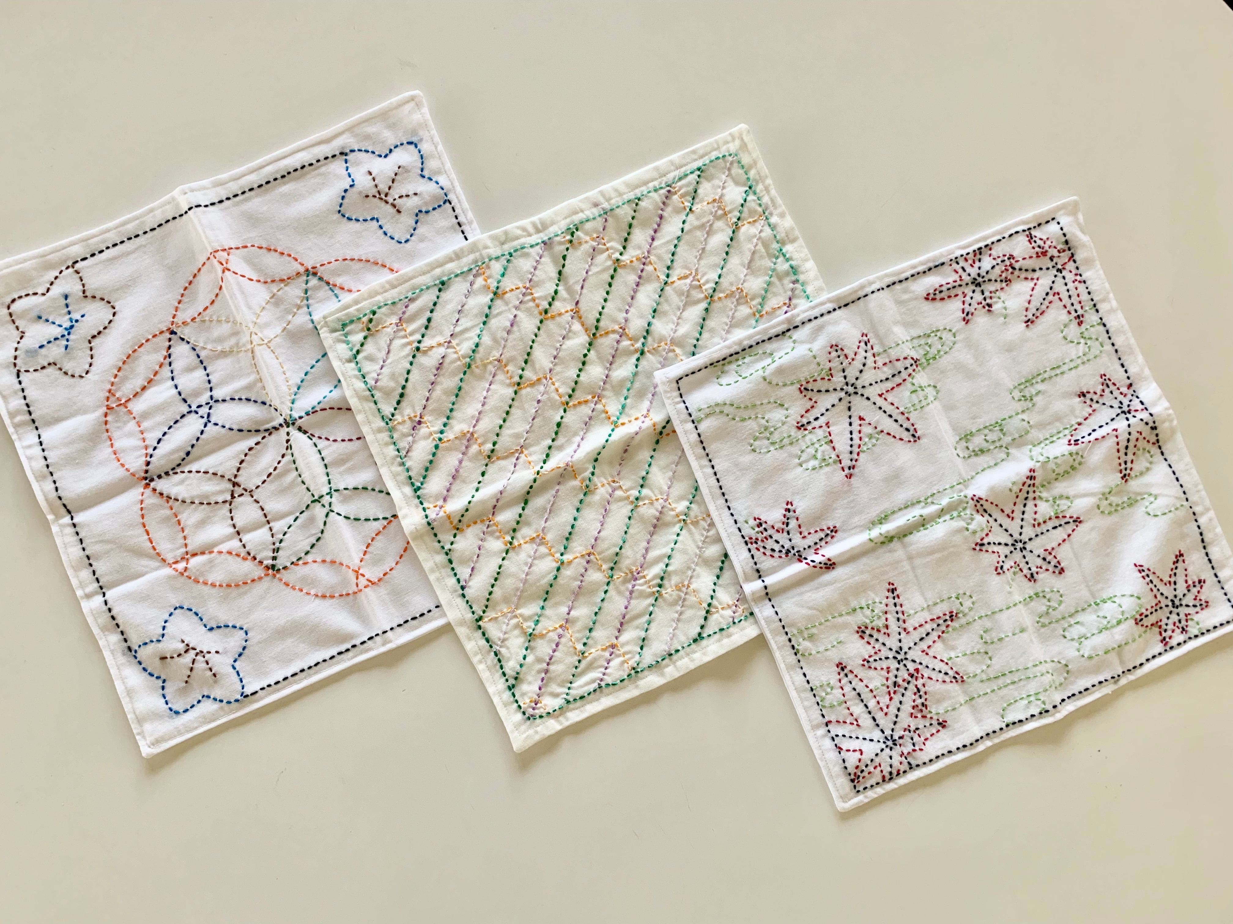 木綿の平織布を数枚重ね、木綿の糸で縫い合わせて模様を刺すことで布を丈夫にし、長く使えるようにしたものです。かつて、日本の一部の地域では女の子が最初に覚える針仕事だったとも言われています。また、むかしはお嫁に行く娘に持たせた、お母さんの愛情がこもった花嫁道具でもあったそうです。